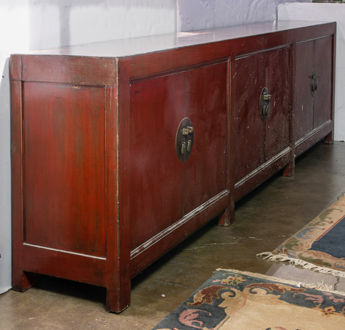 Chinese red lacquered long cabinet
