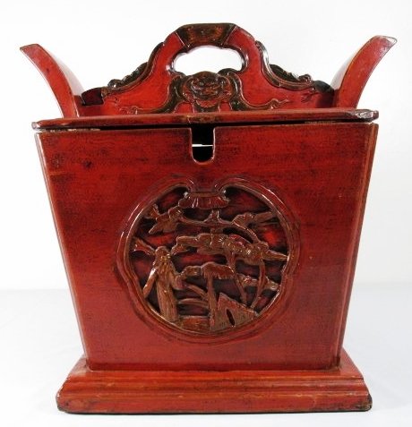 CHINESE RED LAQUER TEAPOT HOLDER OR BOX