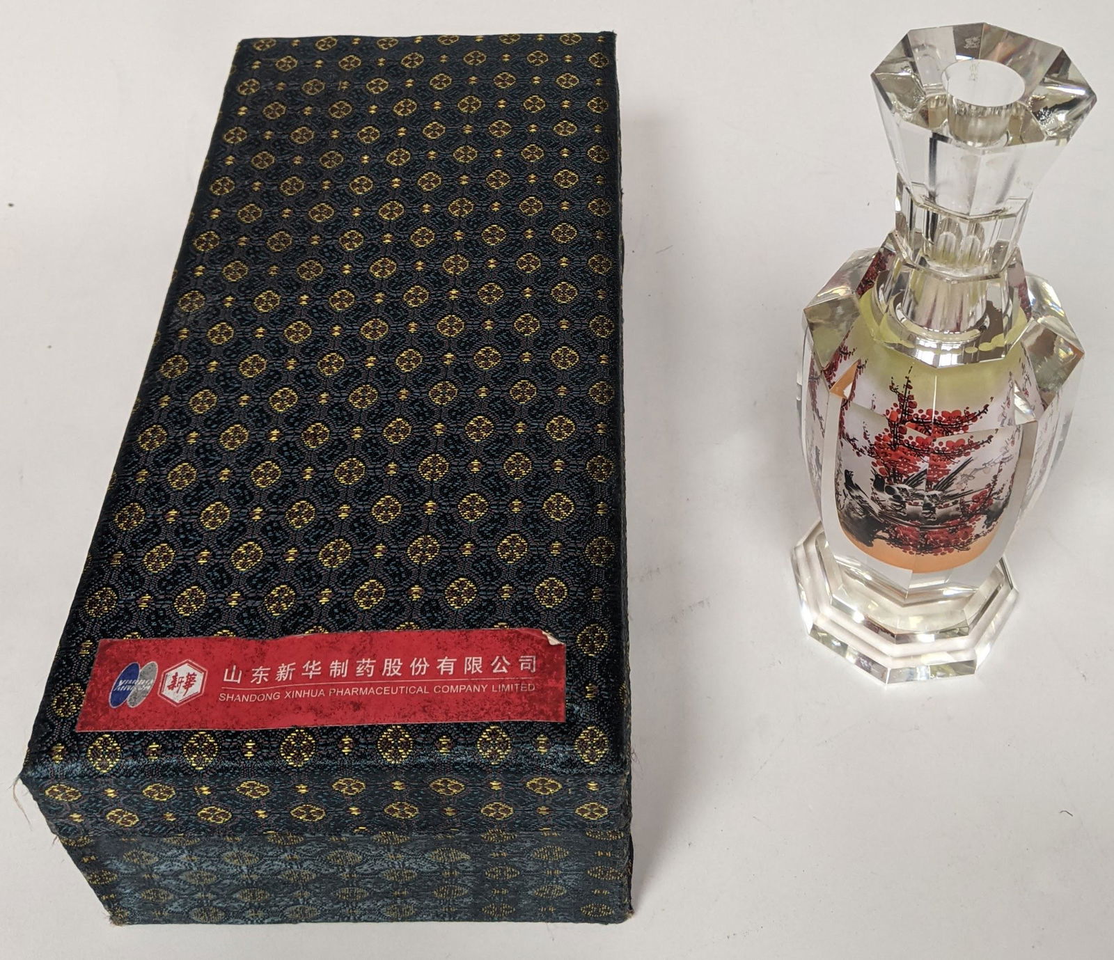 SoldWang Xiaoqian,Chinese Reverse Painted Snuff Bottle"Wang Xiaogian" Chinese reverse painted snuff bottle. dated from Republic Period, Exquisite detail and shading of a vase with lotus flowers and a planter of a tree on one side and table scene on the oSee Sold Price