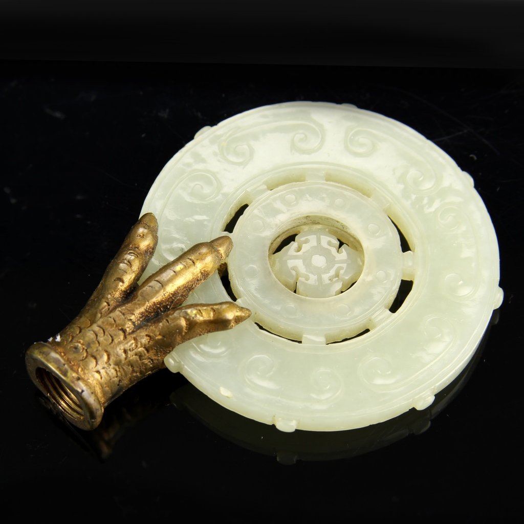 Sold4 Chinese Qing Dynasty Round Jade Pendants4 Chinese Qing Dynasty Round Jade Pendants carved, pierced and polished to both sides in warm white to celadon Jade as a "Lock", an archaistic carved "Bi" with crest with hole, and 2 pierced "Shou" wiSee Sold Price