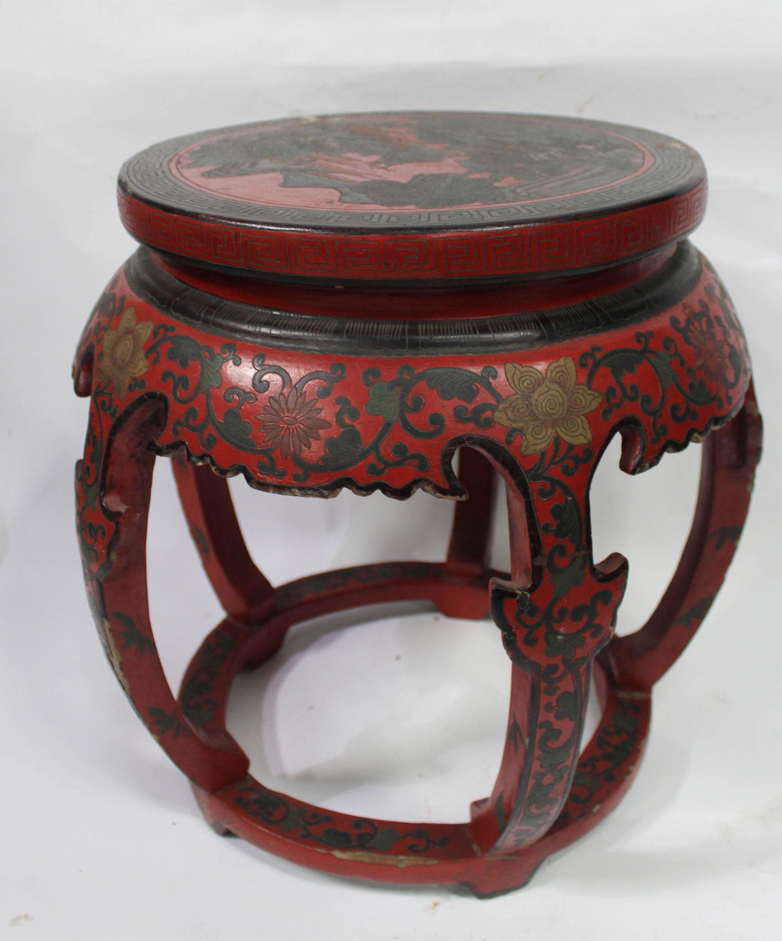 Sold3 Chinese Wooden Stools3 Chinese Wooden Stools. Including: two elm and one red lacquer. Sizes: 1) 6.25'' x 12.75'' x 5.5'' (16 x 32 x 14 cm); 2) 6.25'' x 11.25'' x 5'' (16 x 29 x 13 cm); 3) 7.5'' x 11.5'' x 9'' (19 x 29 x 2See Sold Price