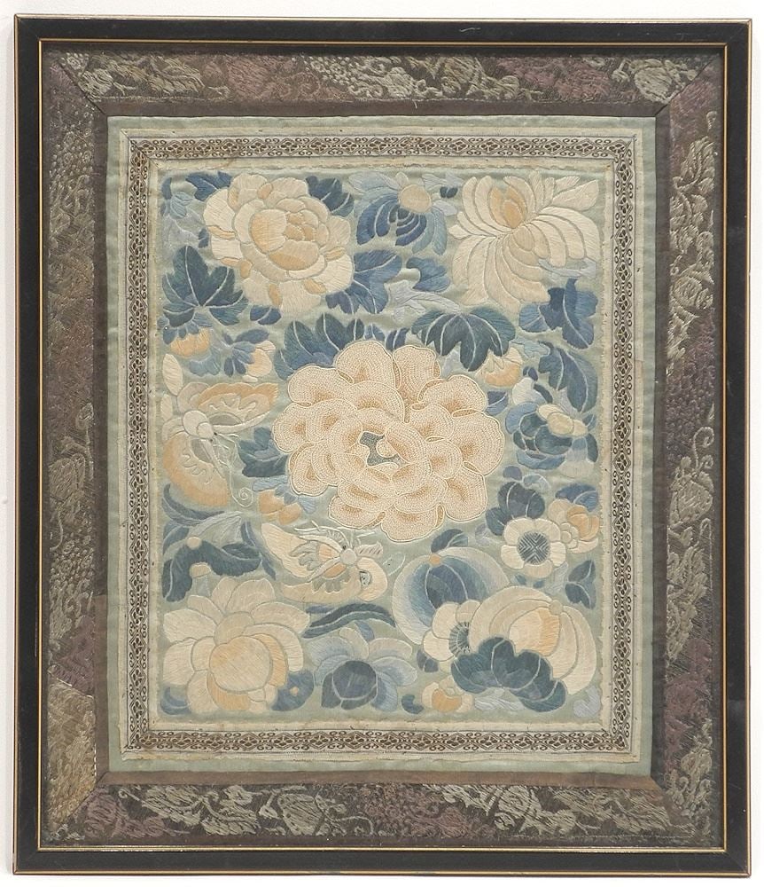 Chinese Silk Stitchery Panel, 13" x 11", Framed.