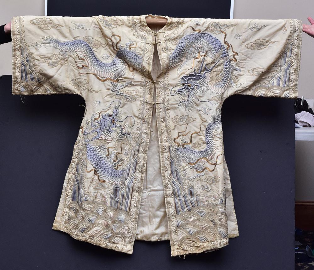Chinese Silk Robe with Dragon & Phoenix Motifs6 days LeftA Chinese silk blue-ground summer gauze 'Dragons' robe, 19th C.Mar 18, 2026Silk Embroidery Cloud and Dragon Pattern Dragon Robe4 days LeftA CHINESE EMBROIDERED DRAGON ROBE7 days LeftChinese Ming summer gauze robe.2 days LeftSilk Embroidery Cloud and Dragon Pattern Dragon Robe4 days LeftANTIQUE EMBROIDERED CHINESE SILK ROBE.3 days LeftA Chinese embroidered silk blue-ground 'Dragons' robe, adapted into a lady's dress, 19th C. andMar 18, 2026A Chinese embroidered silk red-ground women's robe, 19th C.Mar 18, 2026A Rare Brocade Embroidery Imperial Robe5 days LeftChinese Gold Embroidered Silk Court Robe, 19th C4 days LeftA Chinese Silk Embroidered Informal Robe 41-3/4Mar 12, 2026Chinese Silk Embroidered Court Robe, 19th C4 days LeftA Chinese Blue Ground Gold Embroidered Dragon Court RobeMar 04, 2026An Exquisite Kesi Phoenix Pattern RobeMar 07, 2026An Exquisite Kesi Imperial RobeMar 11, 2026