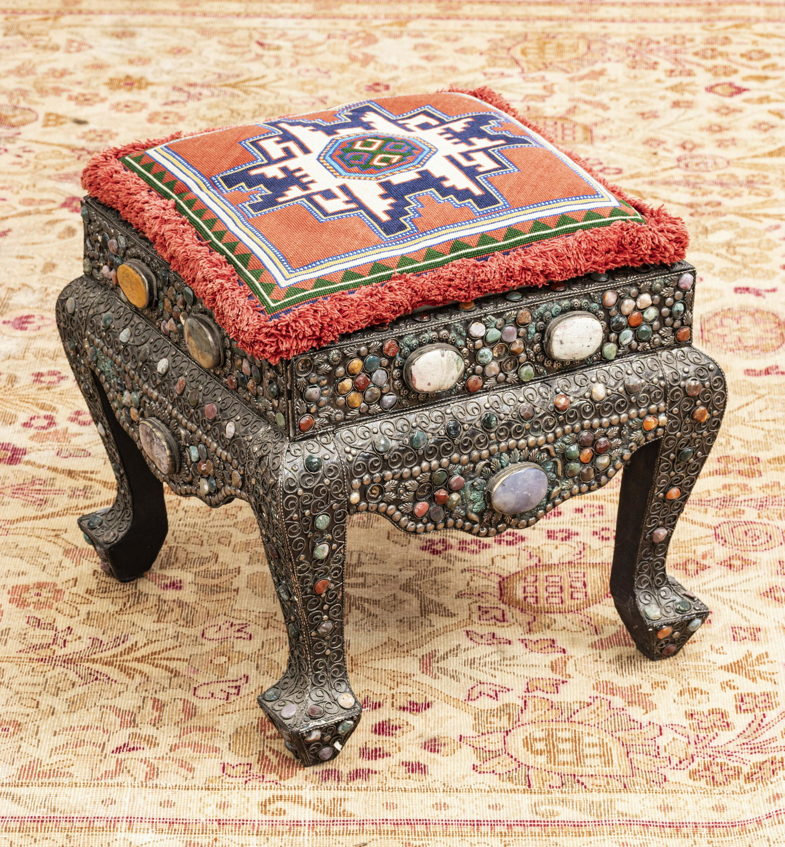 CHINESE SILVER, AGATE, STONE ON WOOD TABLE