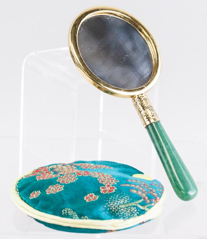 A gilt bronze framed magnifying glass with a jade handle and tourmaline gemstonesCOAUCTION 4.3(13)$7506 hrs Left