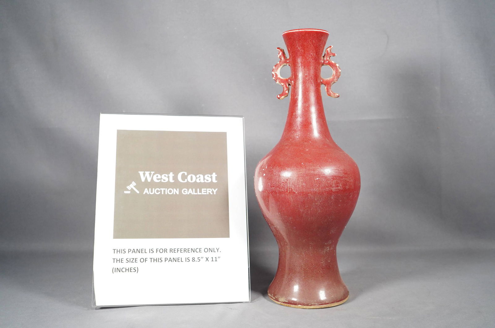 SoldChinese tall red glaze vaseChinese tall red glaze porcelain vase. H: 12.75" x W: 6.5."See Sold Price