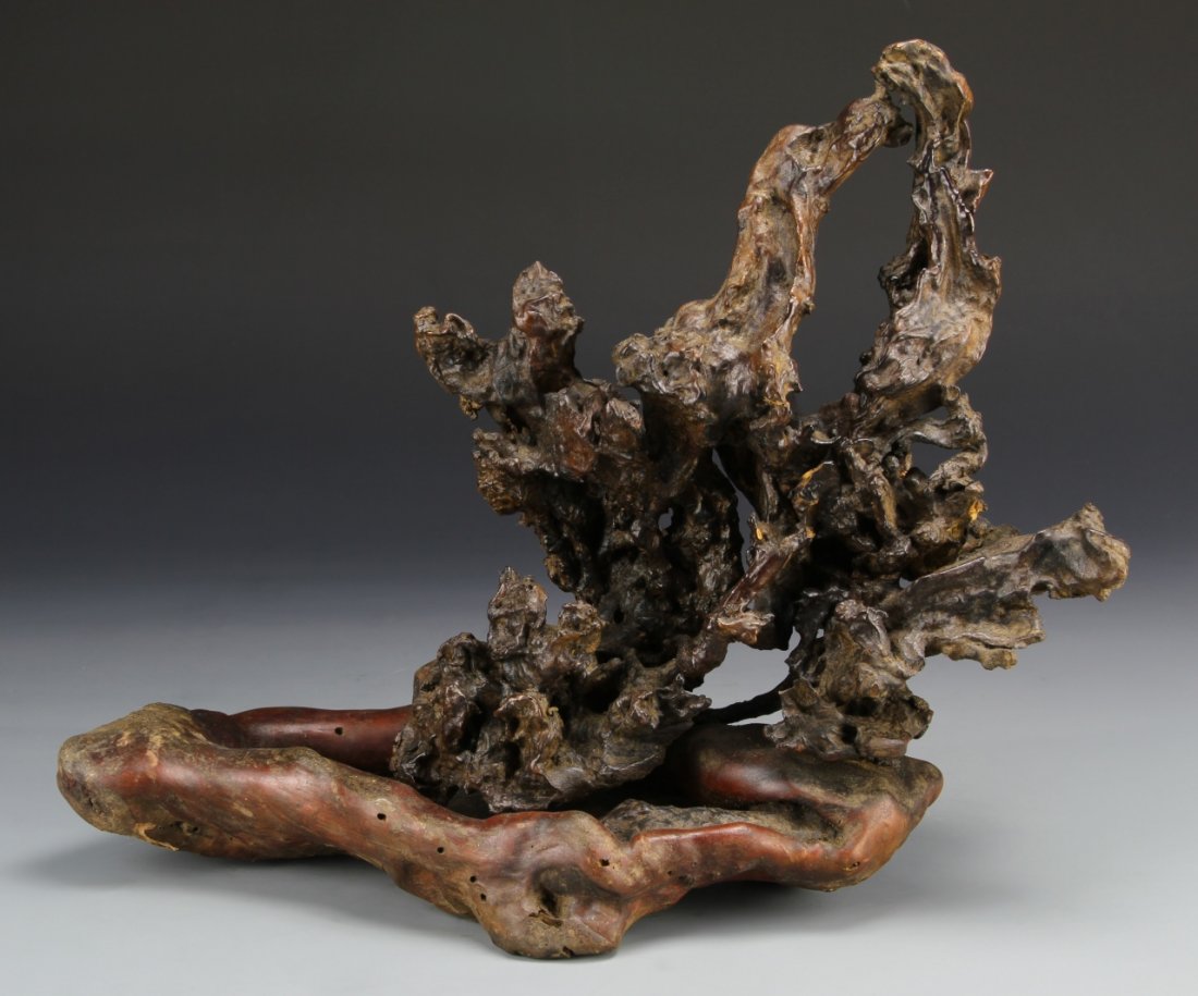 SoldChinese Tree Root CarvingsChina, 18-19th C., intricate tree root carvings, using the natural form and texture or the root, base is rendered with a smooth contrast, with stands. Height 13 1/4 in., Width 13 in.See Sold Price