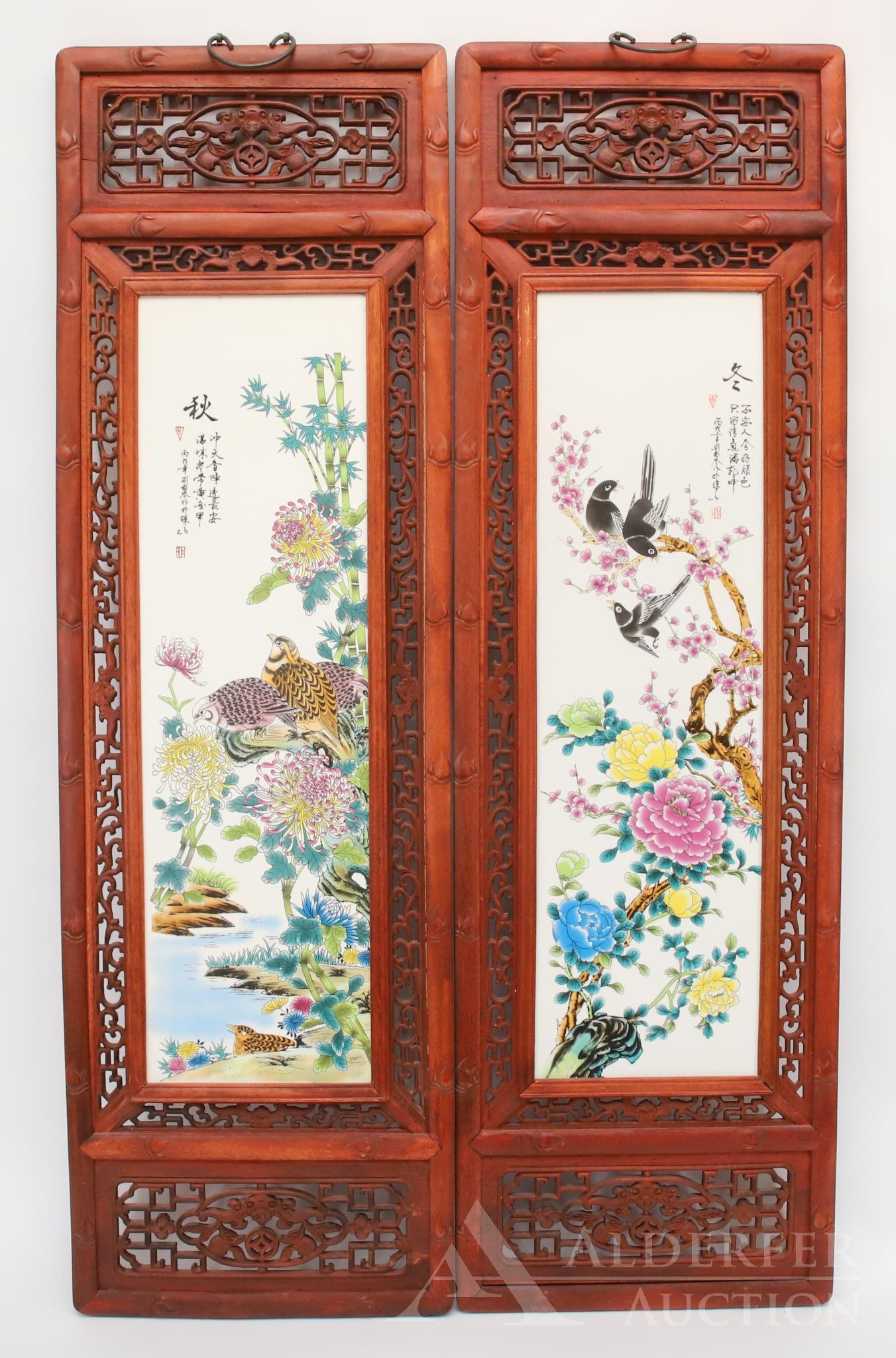 Sold(4) FRAMED CHINESE PAINTED PORCELAIN WALL-HANGING PLAQUES(lot of 4) Framed Chinese painted porcelain plaques, each depicting various flowers and foliate motifs, adjacent to calligraphic inscription, each overall: approx 31"h, 10.5"w, 30lbs totalSee Sold Price