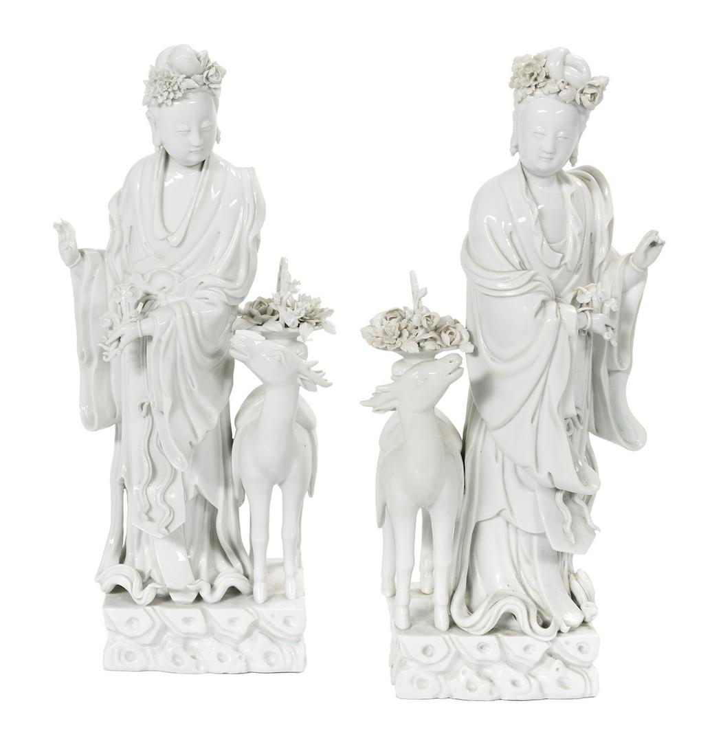 SoldPair of Chinese Blanc-de-Chine Figures of GuanyinPair of Chinese Blanc-de-Chine Figures of Guanyin 20th century, the carefully detailed figures depicted standing with a deer and supporting a basket of flowers at her side, a willow branch in her handSee Sold Price