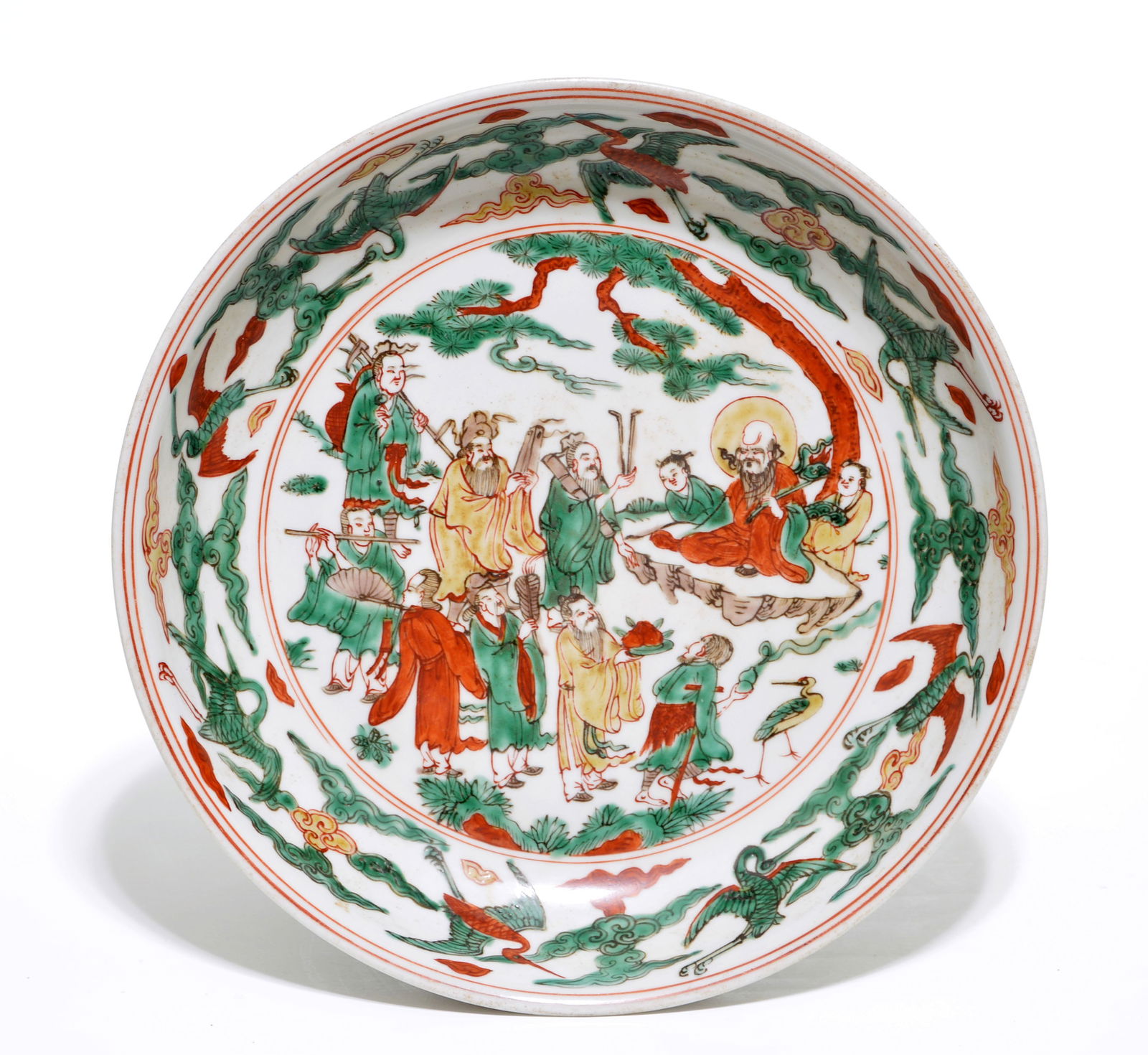 SoldA CHINESE WUCAI PORCELAIN DISH,WANLIA CHINESE WUCAI PORCELAIN DISH,WANLI Decorated with an immortal gathering scene, the god of longevity seated in central, crowed with attendants and followers. Dimension: Diam. 43.5 cm. H. 7.6 cm.See Sold Price