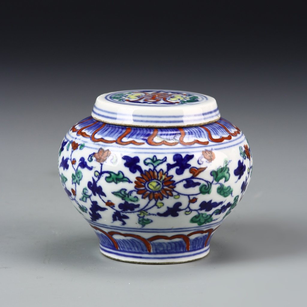 SoldChinese Wucai Jar, Qing DynastyThe height is 5 inches and the width is 5.25 inches. Provenance: From Upstate NY.See Sold Price