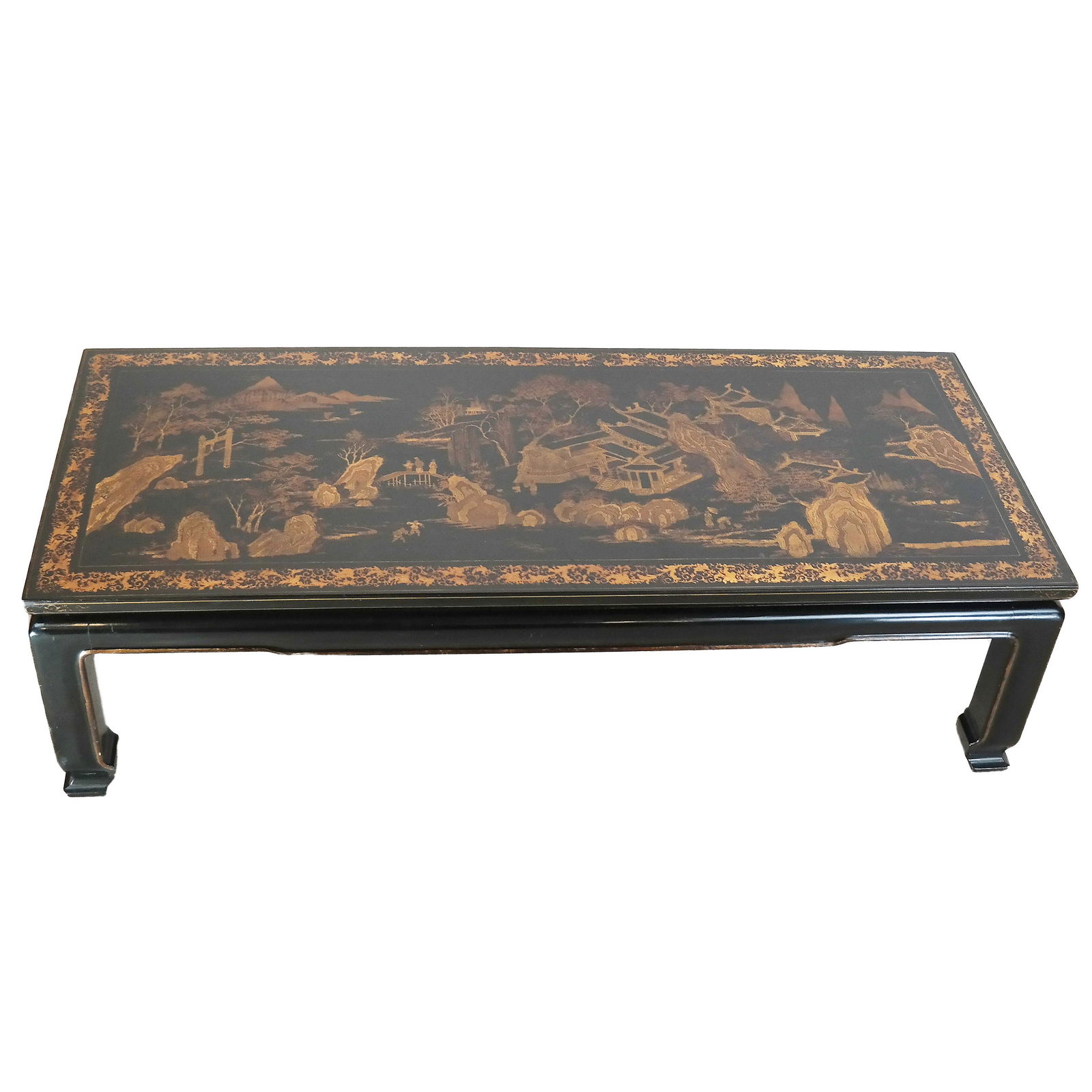 SoldChinese Chinoiserie Lacquered Low TableA Chinese chinoiserie black lacquer low coffee table with gilt decorated top. 17-1/2 in tall x 46 in long x 18-3/4 in deep. Provenance: C. Thomas and Alexandra Fuller Estate Collection of Willow BrookSee Sold Price