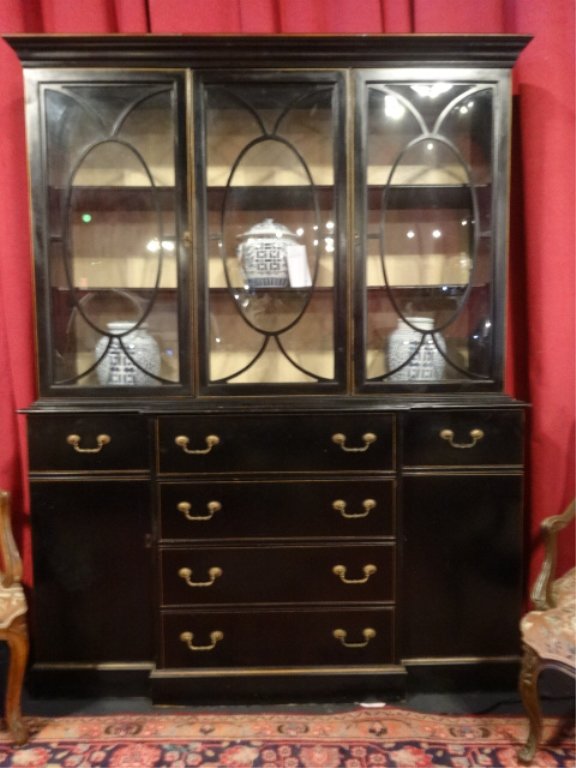 SoldCHIPPENDALE BREAKFRONT, EBONIZED FINISH, BRASS PULLS,CHIPPENDALE BREAKFRONT, EBONIZED FINISH, BRASS PULLS, BUTLER DROP FRONT DESK, BUBBLE GLASS ON 2 OVAL PANELS (LEFT OVAL PANEL IS FLAT GLASS), VERY GOOD VINTAGE CONDITION, APPROX 6' X 7'See Sold Price