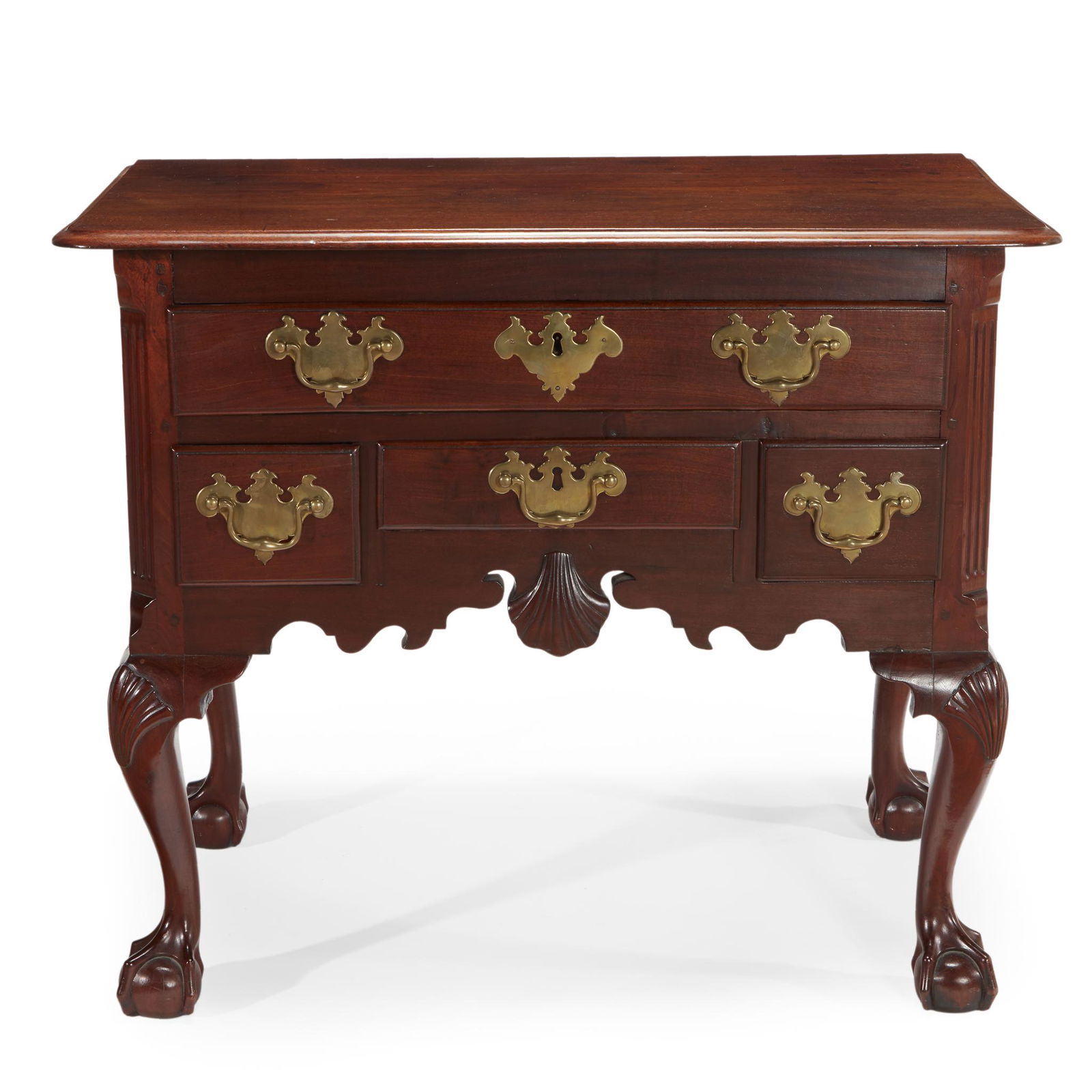SoldCHIPPENDALE DRESSING TABLE.Reputedly Philadelphia, mahogany with pine secondary. Top with routed edge, one over three dovetailed drawers, center drawer with carved fan, scalloped apron, cabriole legs with ball and claw feet. ReSee Sold Price
