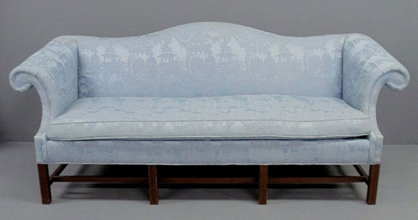 Chippendale style camelback sofa with light blue d
