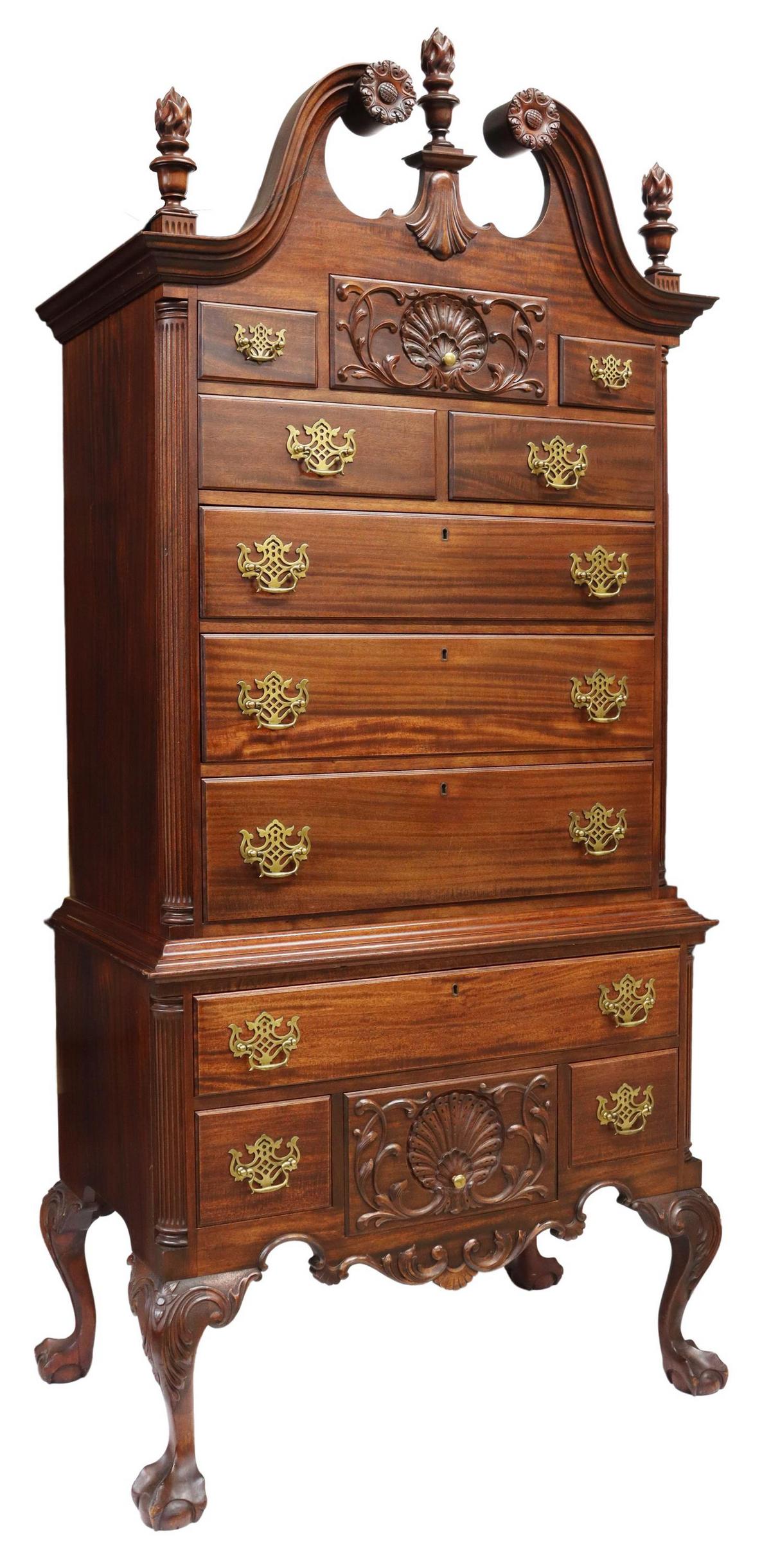 SoldCarved mahogany Chippendale style 2-part scroll top highboyCarved mahogany Chippendale style 2-part scroll top highboy, closed bonnet top, with gadrooned carving, top section with three short over 4 long beaded drawers, central top drawer with shell carving,See Sold Price