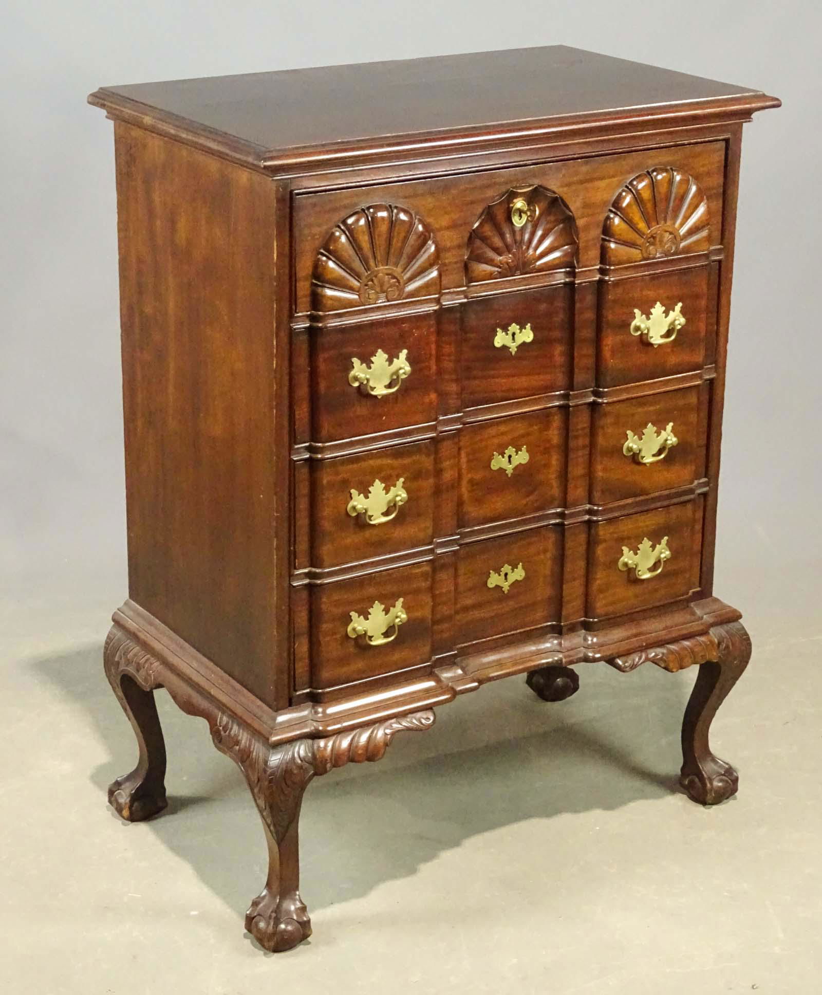 SoldAMERICAN CHIPPENDALE STYLE CHEST.Late 20th century, cherry with pine secondary. Goddard Townsend style block front kneehole desk with dovetailed drawers, the top one having shell carving. Ogee scroll feet, center shell carved door. LSee Sold Price