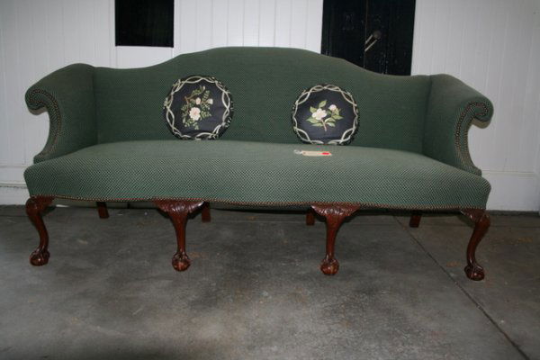 CHIPPENDALE-STYLE CVD. CAMEL BACK SOFA, W/SCROLL