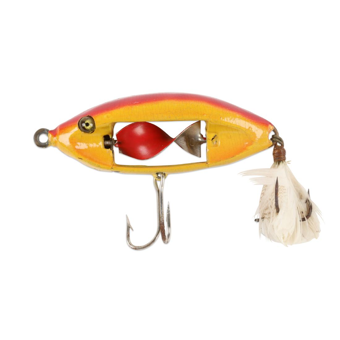 SoldChippewa in Red and YellowImmell Bait and Tackle Company, United States. 1910s. Material: Wood. Quantity: 1. Grade: VG-. 4" Est. $550-650.See Sold Price