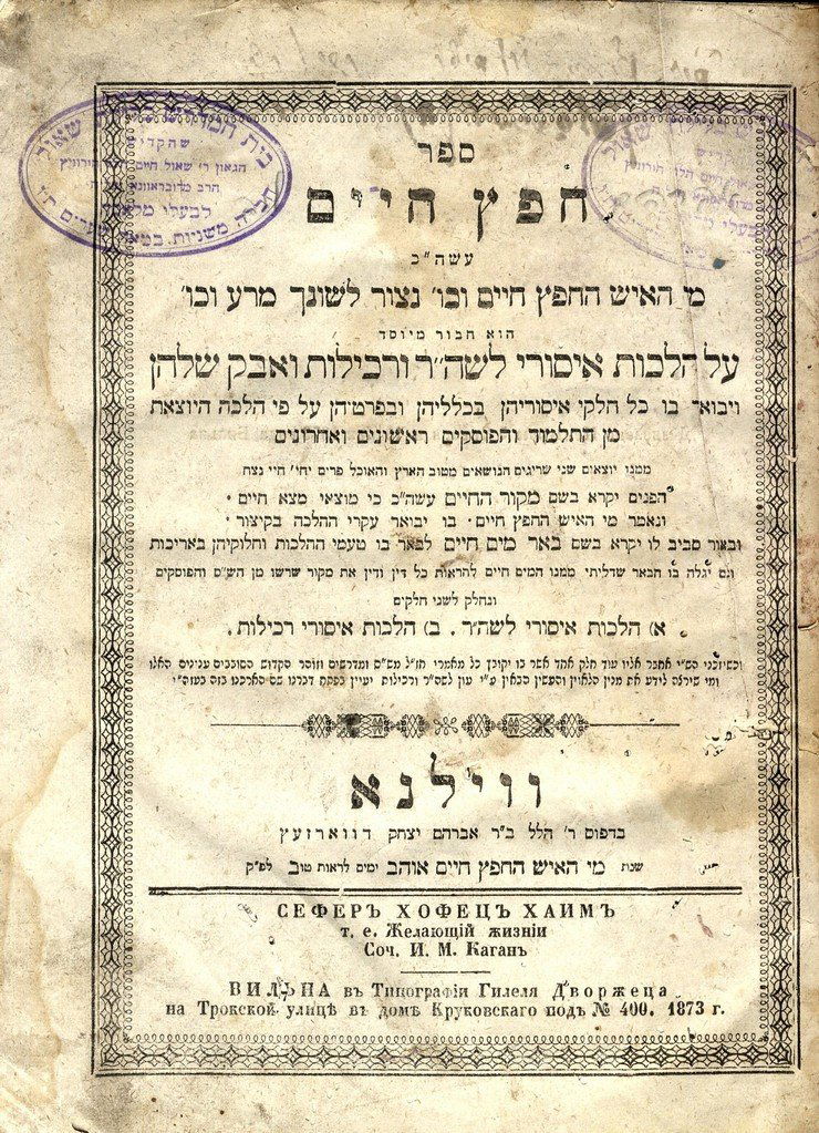 Chofetz Chaim. Vilna, 1873. First Edition.