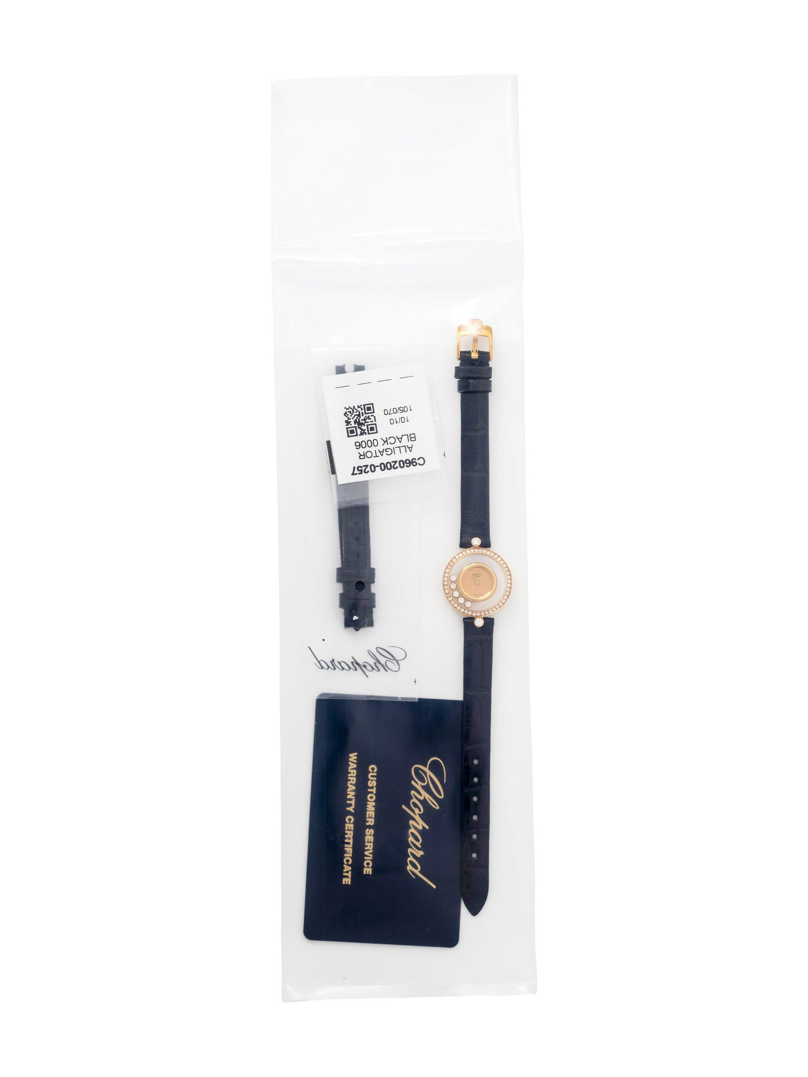 SoldA lady's leather bracelet and gemstone wristwatch, Chopard "Happy Diamonds" Ref. 20.4069A lady's leather bracelet and gemstone wristwatch, Chopard "Happy Diamonds" Ref. 20.4069 18K, quartz watch, champagne dial, leather bracelet, eighteen karat gold buckle, two each bezel set diamonds seSee Sold Price