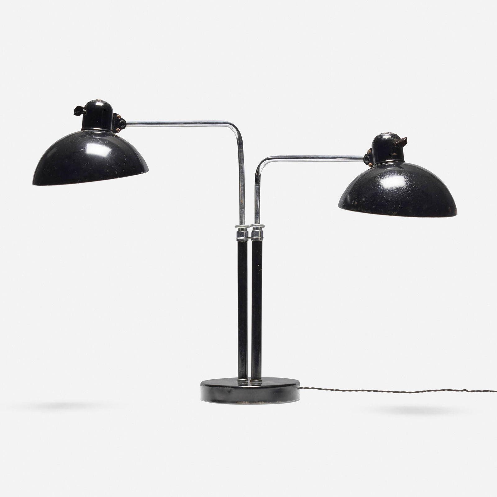 SoldChristian Dell Double Dell Table LampChristian Dell Double Dell Table Lamp, c. 1933, enameled steel, chrome plated brass, and Bakelite, Kaiser & Co., Germany, each shade marked "Kaiser Dell Original", h. 12 in., fully extended dia. 36 inSee Sold Price