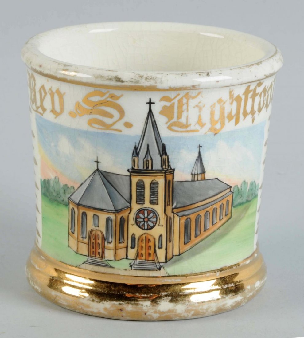 SoldA Clergyman's Porcelain Occupational Shaving MugA Clergyman's Porcelain Occupational Shaving Mug Early 20th Century faintly bearing the name Rev. J. Scheja in gilt lettering, and depicting a church with the date 1910. underside unmarked. Height 3 3See Sold Price
