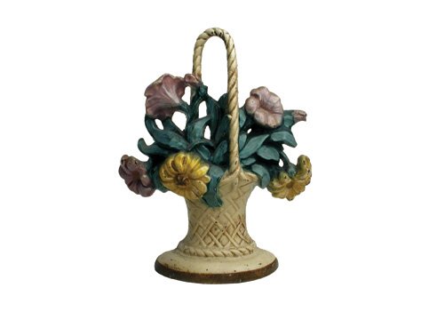 SoldAntique/Vintage Painted Iron Doorstop Flower PotAntique/Vintage Painted Iron Doorstop Flower Pot, with cream and black striped pot, multi - colored flowers. Remains in good original condition with scattered paint chips. Measures 7 1/4" tall.See Sold Price
