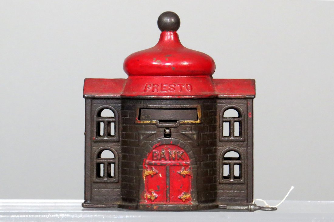 Delicious Goodies 1-cent candy vendorMar 28, 2026Hall's Excelsior BankMar 07, 2026BEST Lock Corporation Model B Exit Lock6 days LeftTower BankMar 07, 2026Cupola Bank - MediumMar 07, 2026Crown Bank - LargeMar 07, 2026Finial BankMar 07, 2026Antique Cast Iron US Mail Box BankMar 07, 2026Bankers Dust Proof Time Lock Co Time Lock Mechanism6 days LeftDisney Happynak Tin Litho Bank Mickey Mouse Post Office Bank 19306 days LeftMinniToys Imperial Esso Products Semi & Tanker Press Steel TruckMar 24, 2026House with BasementMar 07, 2026Four Tower BankMar 07, 2026Patronize the Blind Man BankMar 07, 2026Birth Bank with Bird FinialMar 07, 2026Mason cast iron mechanical bankMar 28, 2026