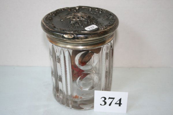 AMERICAN STERLING SILVER AND BRASS SMOKING ARTICLES, LOT OF TWOMar 04, 2026Lot of sterling silver dresser accessories, including various covered glass jars and scent bottles.Mar 01, 2026Vintage Sterling Silver and Glass Perfume BottleCut Crystal Biscuit Jar with Sterling Silver LidMar 15, 2026Sterling silver covered cut glass humidor. Thistle pattern cut glass decoration. Sterling cover withMar 01, 2026Sterling Silver (77g) Mounted Crystal Round Jar With Lid6 days LeftSterling Silver Beaded Cigar Jar with Axe Emblem 7" TallMar 04, 2026A Sterling Silver Art Nuveau Jar20 hrs LeftVintage Sterling Silver Lidded Zipper Cut Glass Biscuit JarMar 01, 2026Sterling Silver Yo-Yo and Cut Glass & Sterling Vanity Jar7 days LeftEtched Glass and Sterling Top JarMar 01, 2026Vintage Kroger Peanut Butter Glass Jar with Metal Lid WATCHMAKER WATCHMAKING TOOLS1 hr LeftTwo American Sterling Silver & Cut Crystal Powder JarsMar 04, 2026Steuben sterling silver lidded glass jar. Hobnail and tendril design. Mechanical hinged opening.Mar 01, 2026Decorative Glass Jar Large Glass JarJul 21, 2025Vintage Glass Apothecary JarMar 04, 2026