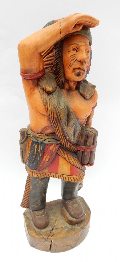 SoldCarved wooden cigar store Indian statueCarved wooden cigar store Indian statue with great color, 58"H plus wooden base 18"x18"x18"H - Very Good, crack in left leg, right elbow has some repair * * BUYER TO ARRANGE PICK-UPSee Sold Price