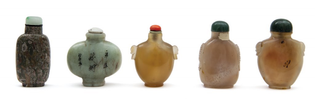Cinque snuff bottle in agata e pietre dure, una