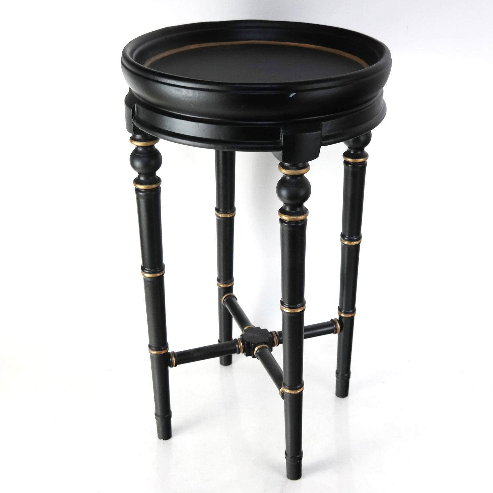 SoldCircular Occasional TableCircular black ebonized occasional table with gilt highlights. [22" H x 13" W x 13" D].See Sold Price