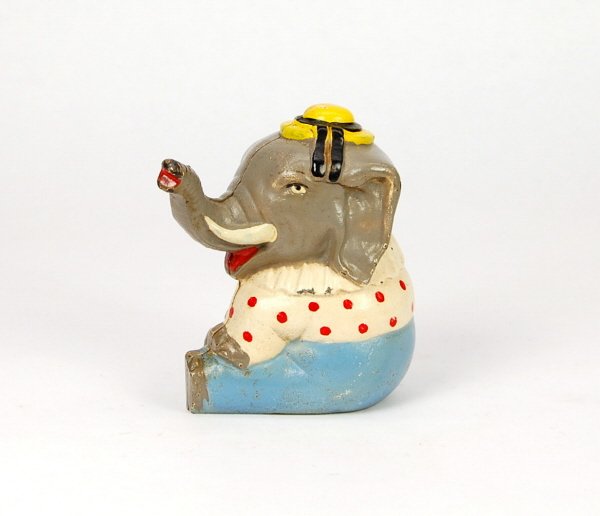 SoldOriginal Cast Iron Circus Elephant Still BankOriginal 4 inch cast iron elephant still bank. Old gold paint. Excellent conditionSee Sold Price