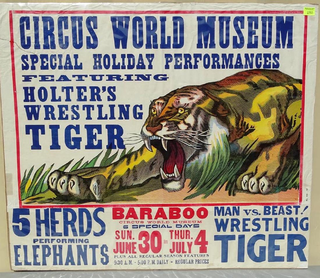 CHARLES I.D. LOOFF JUMPER HORSE ON STAND, C. 190011 hrs LeftPOLYCHROME CARVED WOOD CAROUSEL HORSE, E. 20TH C.11 hrs LeftG. A. Dentzel Stander Carousel Horse 1885-1890Apr 11, 2026Jumbo The Elephant Monumental Canvas Circus Banner4 days LeftAmerican, Pontchartrain Beach advertising sign with clown2 days LeftJoseph Ferrillo - WPA Style - Circus with Elephant11 hrs LeftCharles Fazzino 'Coney Island' 3-D L/E Serigraph2 days LeftChicago Band Box Automaton4 days LeftRingling Bros and Barnum and Bailey Circus Poster3 days LeftUncle Ben’s Kiddieland Vintage Carousel Horse,5 days LeftBox lot of (8) vintage movie theater posters6 days LeftEugeniusz Geppert (Polish, 1890-1979) Circus, Oil Painting, 28" x 36"Apr 14, 2026THE KING AERATOR TIN OVER CARDBOARD SIGN3 days LeftModel of Ringling Bros. Barnum & Bailey Circus "Two Hemispheres" Parade Bandwagon2 days LeftFrench "La Banane" Mid Century Advertising Poster4 days LeftMardi Gras Ball Invitation, Rex, 1880, Invitation- Open- H.- 10 7/8 in., W.- 11 1/8 in., Closed- H.-2 days Left