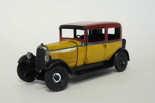 SoldClockwork Tin Toy CarAn early 20th century clockwork Tin toy car by "Andre Citroen, France". Sedan design with four operating doors, electric headlights, running boards and rubber wheels. Original two color painted finishSee Sold Price