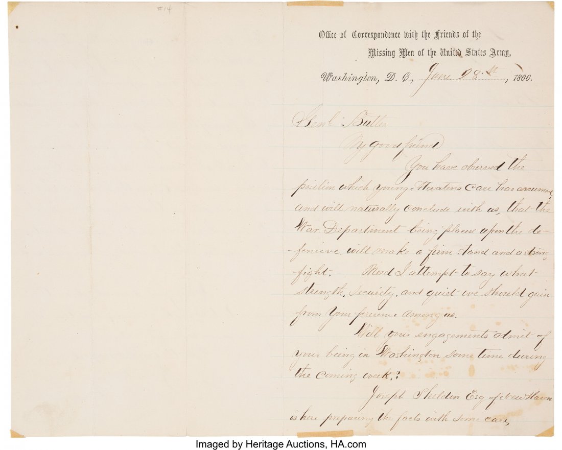 PA Civil War Letters: Prison Guard, Lieutenant , etc.Mar 02, 2026Elisha Burr New York 147th letters GettysburgMar 02, 2026Charles Devens & Civil War & Post-war LettersMar 02, 2026George A. Custer Period Fair Copies of Two Lette6 days LeftAbraham Lincoln Handwritten and Signed Notation, Wartime5 days LeftDeclaration Signer William Floyd Autograph Lette6 days Left1861 Harper's Ferry related Civil War LettersMar 02, 20261861 D.C. & Virginia letters, discharge & passMar 02, 2026Civil War Soldier's Letters (2) by Seneca Cowles6 days LeftGettysburg battle by woman who tended to sickMar 02, 2026Frank Place 157th NY Infantry POW at GettysburgMar 02, 2026William A. Denny 1st Lieut. Ohio 98th Infantry LetterMar 02, 2026Civil War Soldier's Letter with Battle of Dranes6 days LeftUlysses S. Grant Autograph Letter Signed. Two pa6 days LeftShenandoah Valley: Officer, Twice POW & EscapedMar 02, 2026Civil War Soldier's Letter by Martin Luther Moor6 days Left