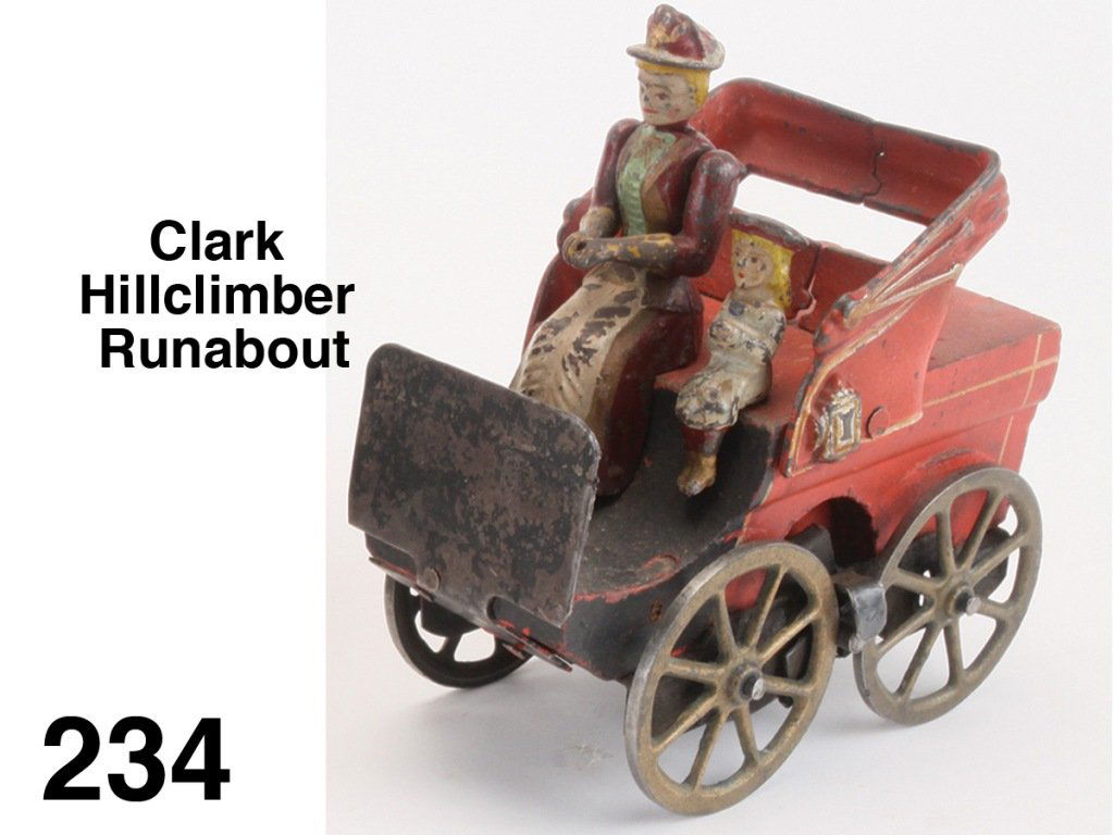 SoldA D.P. Clark hill climber toy horseless carriageA D.P. Clark hill climber toy horseless carriageCirca 1903UnmarkedThe toy with painted tin and wood body, metal wheels powered by a friction drive, and polychrome cast iron riders and driver, one withSee Sold Price