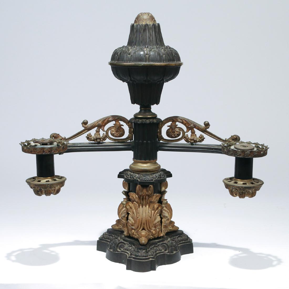 SoldBronze Double-Arm Argand Lamp "B. GARDINER"American Late Classical Bronze Double-Arm Argand Lamp , c. 1835, labeled "B. GARDINER/N.YORK", bouquet decorated standard, scroll feet, electrified, h. 18 in., w. 18 in., d. 10 inSee Sold Price