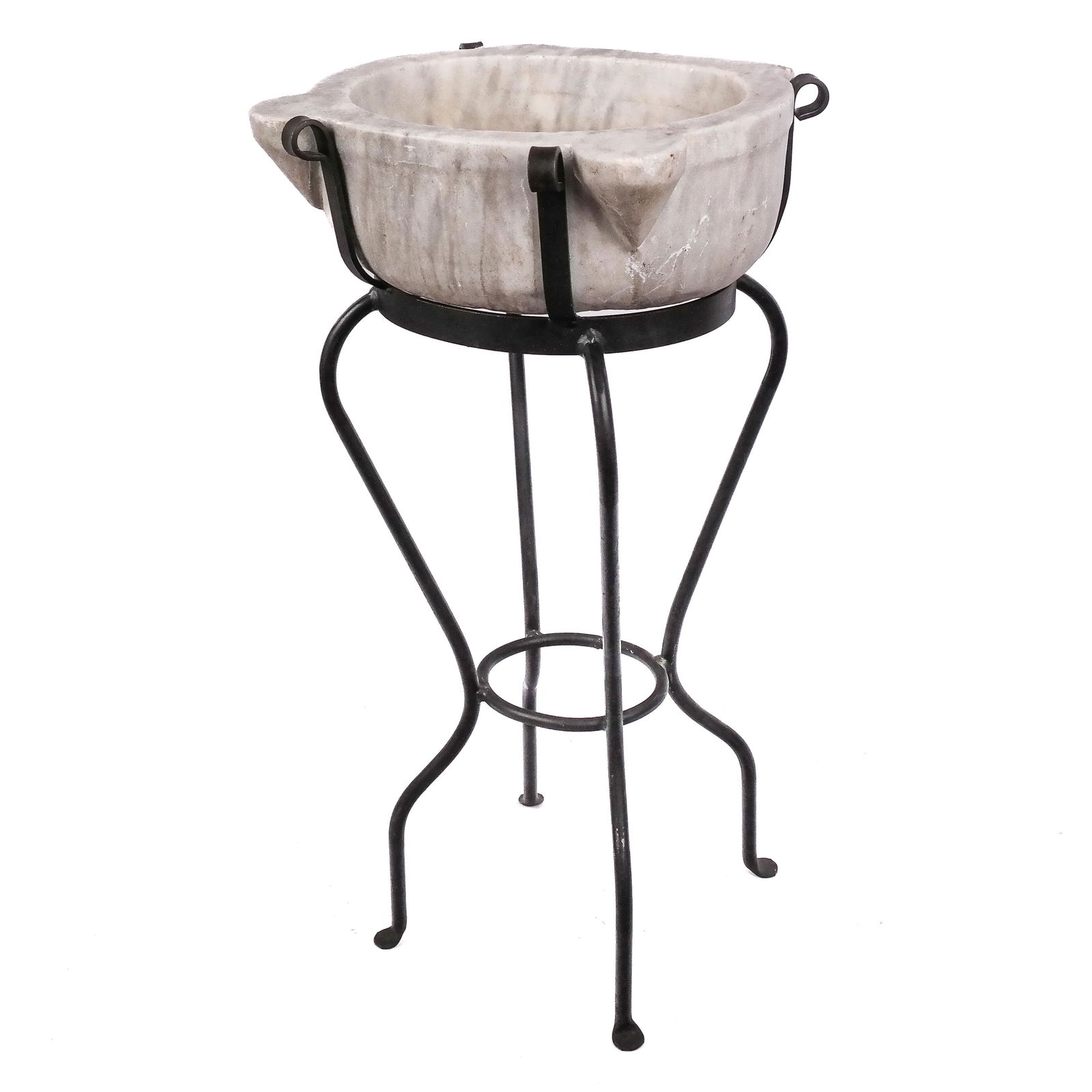 SoldClassical-Style Marble Basin on Iron StandClassical-style marble font basin on wrought iron stand, 20th century. [40 1/2" H x 19" W x 17" D]. Scratches and losses to marble; oxidation to base.See Sold Price