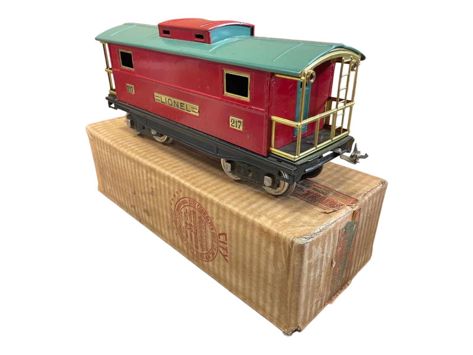 SoldBoxed Lionel 217 CabooseStandard Gauge. Clean & shiny mid period colors. It shows light to moderate playwear, C6+-7See Sold Price
