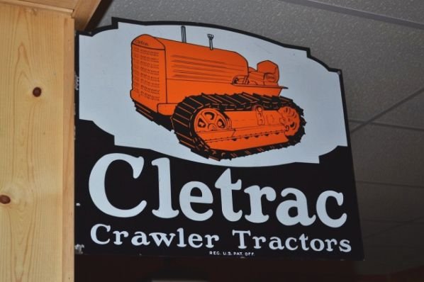 SoldNOS Cletrac Crawler Tractors DS Porcelain Flange SignNew Old Stock Cletrac Crawler Tractors Double Sided Porcelain Flange Sign TAC 9.5 & 9.25. DSP (double sided porcelain) flange sign has amazing color and gloss. The field is clean on both sides. There'See Sold Price
