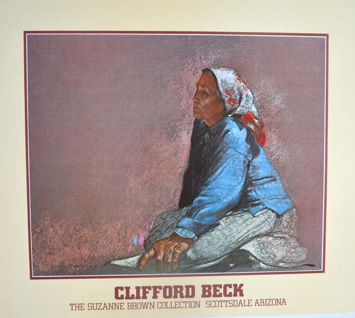 SoldClifford Beck (1946 - 1995 Flagstaff, AZ)Two Native American women in profile, 1987 Mixed media on paper under glass Signed and dated lower left: C. Beck and with the copyright symbol Sight: 25.5" H x 39" W Provenance: Private Collection, PaSee Sold Price