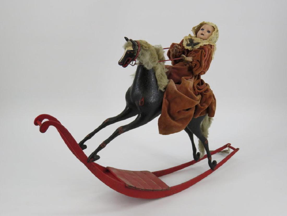 SoldGerman automatonGerman automaton, bisque head gypsy doll riding rocking horse, wind-up on belly of horse, doll moves as if riding a horse, signed on bottom W. Summerbell A.A.-SH4, wooden arms, legs, and rocking horseSee Sold Price