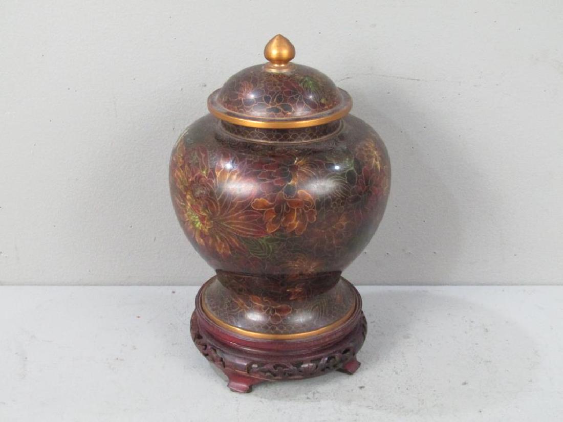 SoldChinese Cloisonne Covered JarChinese cloisonne covered jar. 9in with stand. Age wear.See Sold Price