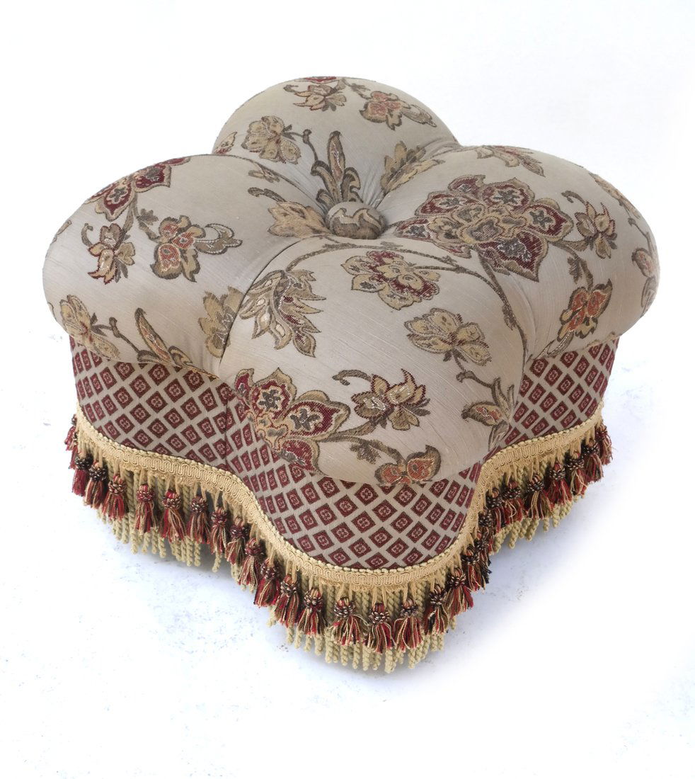 SoldCloverleaf Decorated Upholstered OttomanAn Ashley Manor decorator upholstered ottoman of cloverleaf form with tassel trim. Provenance: From a Rittenhouse Square, Philadelphia apartment designed by interior designer Barbara Eberlein. 19in taSee Sold Price
