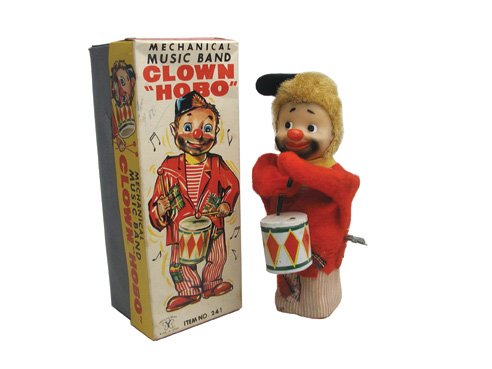 SoldTPS ROLLER SKATING HOBO CLOWN WINDUP & BOXMade in Japan by TPS. Tin Lithographed Skating Hobo Clown Windup Wearing Silk Pants & Original Box. 1950's 6.5" HSee Sold Price