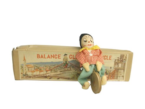 SoldTECHNOFIX MERRY CLOWN ON BICYCLE 264 TIN WINDUPMade in US Zone Germany by Technofix. Very rare & hard to find 1951 brightly colored lithographed tin wind up Technofix Merry Clown Peddling Bicycle #264. Measures 5.5" L x 5.75" H.See Sold Price