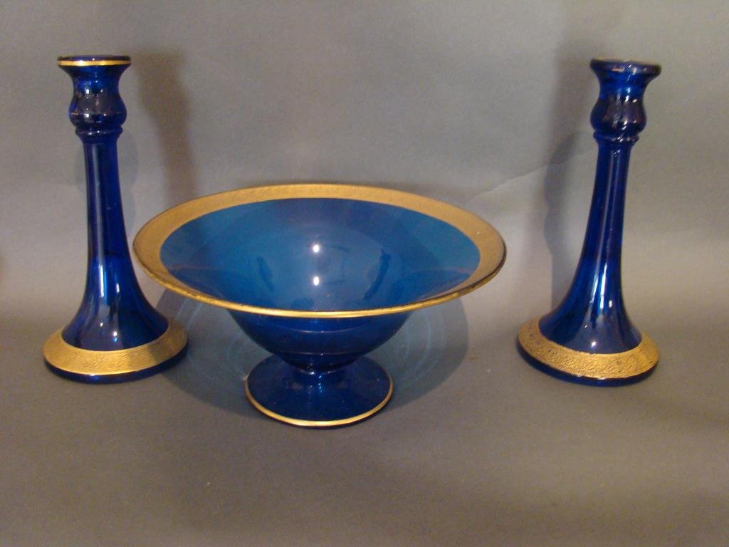 SoldTHREE-PIECE SIGNED MOSER COBALT BLUE GLASS CONSOLE SET Czechoslovakia, Early 20th CenturyTHREE-PIECE SIGNED MOSER COBALT BLUE GLASS CONSOLE SETCzechoslovakia, Early 20th CenturyMatched set comprised of a vase and a pair of candlesticks. Gilt banded decoration of female warriors. Each withSee Sold Price