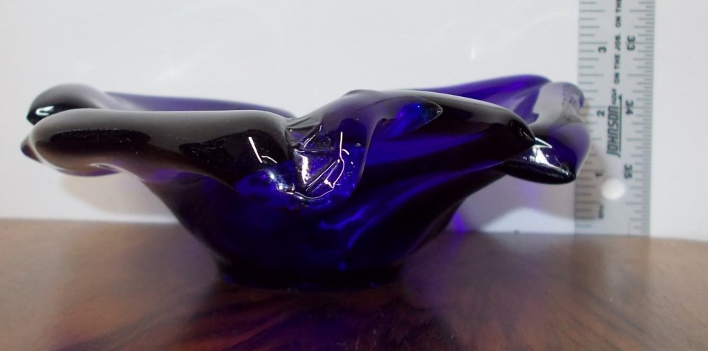 SoldVntg Cobalt Blue Glass Swan Candy DishHand-blown glass swan candy dish. Body of swan features a cobalt blue bowl with a scalloped edge & a diamond pattern. No visible signature or markings. Surface wear consistent to age, use & exposure.See Sold Price